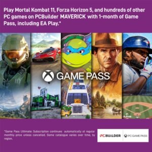 The PCBuilder MAVERICK Windows 11 Gaming PC also includes one month of PC Game Pass including EA Play. Play over 100 high-quality PC games, in various genres such as Halo Infinite, Forza Horizon 5, and Minecraft on your new gaming rig. With new games added all the time, there’s always something new to play from day one.